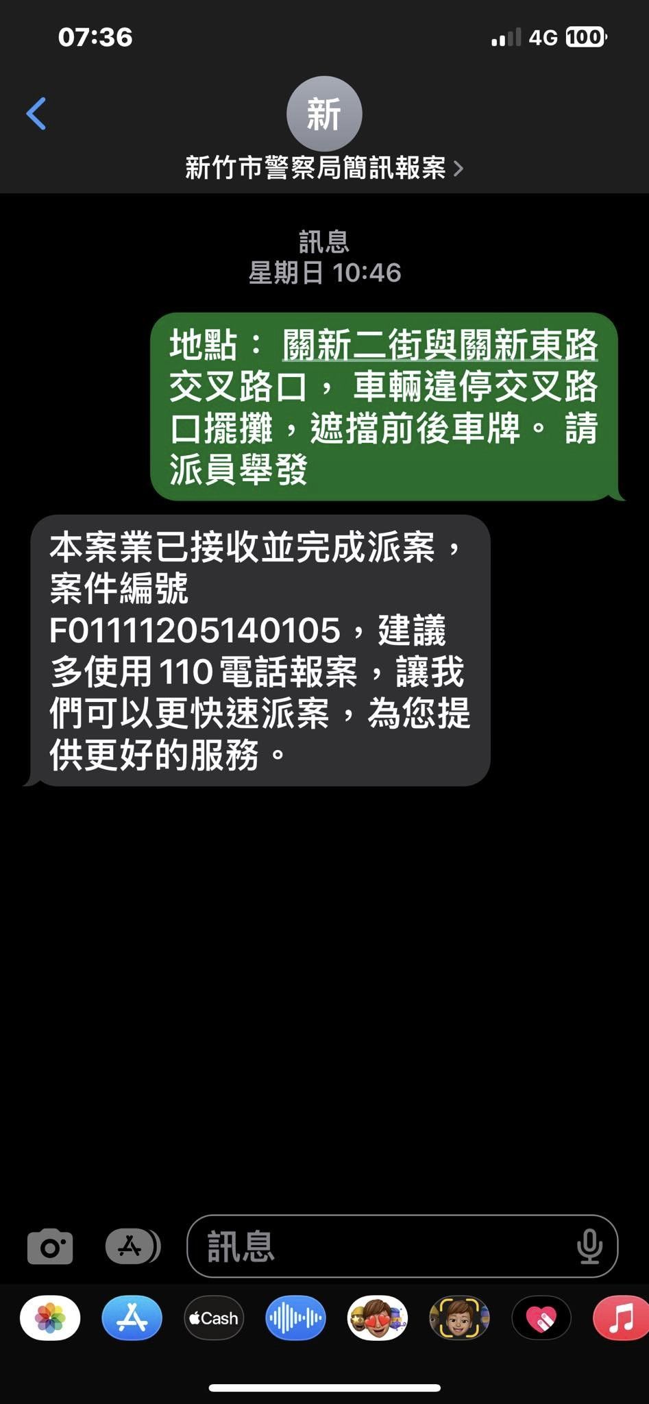 既然無法拍車牌檢舉,只好請員警跑一趟,發出簡訊10分鐘後就抵達現場。