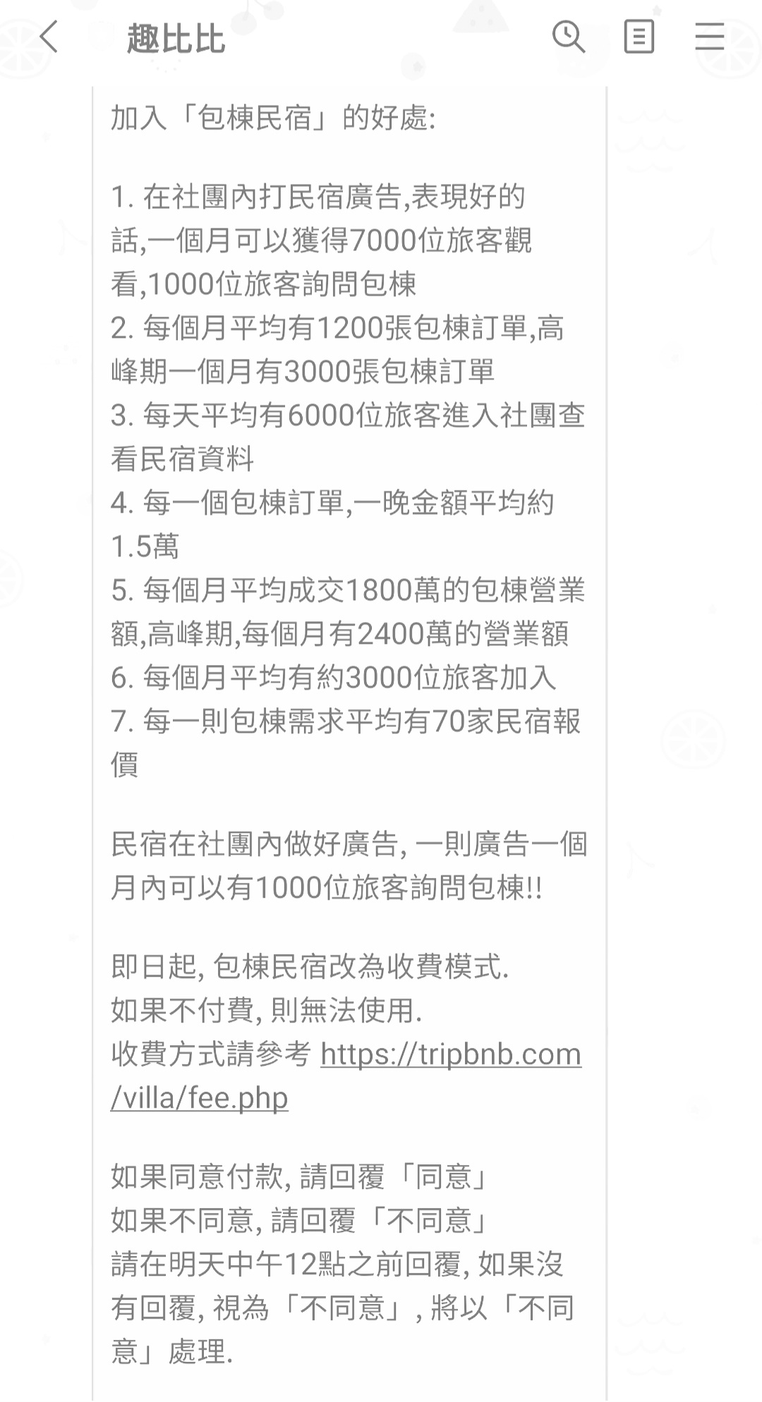 只要是民宿業者,要在包棟民宿社團內廣告或尋找住宿的貼文下方留言,就需要跟板主繳費。(原本為公開,也無需費用)
