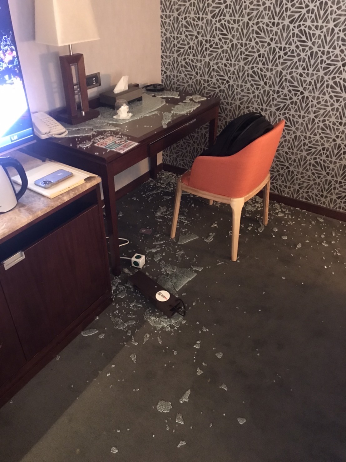 飯店電話中(林姓主管) 聲稱已檢查他們的電壓沒問題,指名是我的充電插頭有問題。以及聲稱問過玻璃廠商說玻璃不會自爆。因事發當時嚇到,沒有報警也沒有申請鑑定。