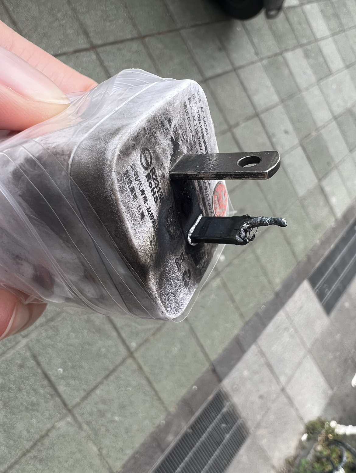 3/25 我向飯店要回插頭送回原廠送檢,報告結果為:「充電孔處並無起火點而使用功能皆正常,排除充電器,無異常; 而二支插腳處是最為嚴重,研判是由外部使用時造成短路起火。」內部沒燒毀,鑑驗表示是外部原因造成。已獲得一份廠商檢定報告。