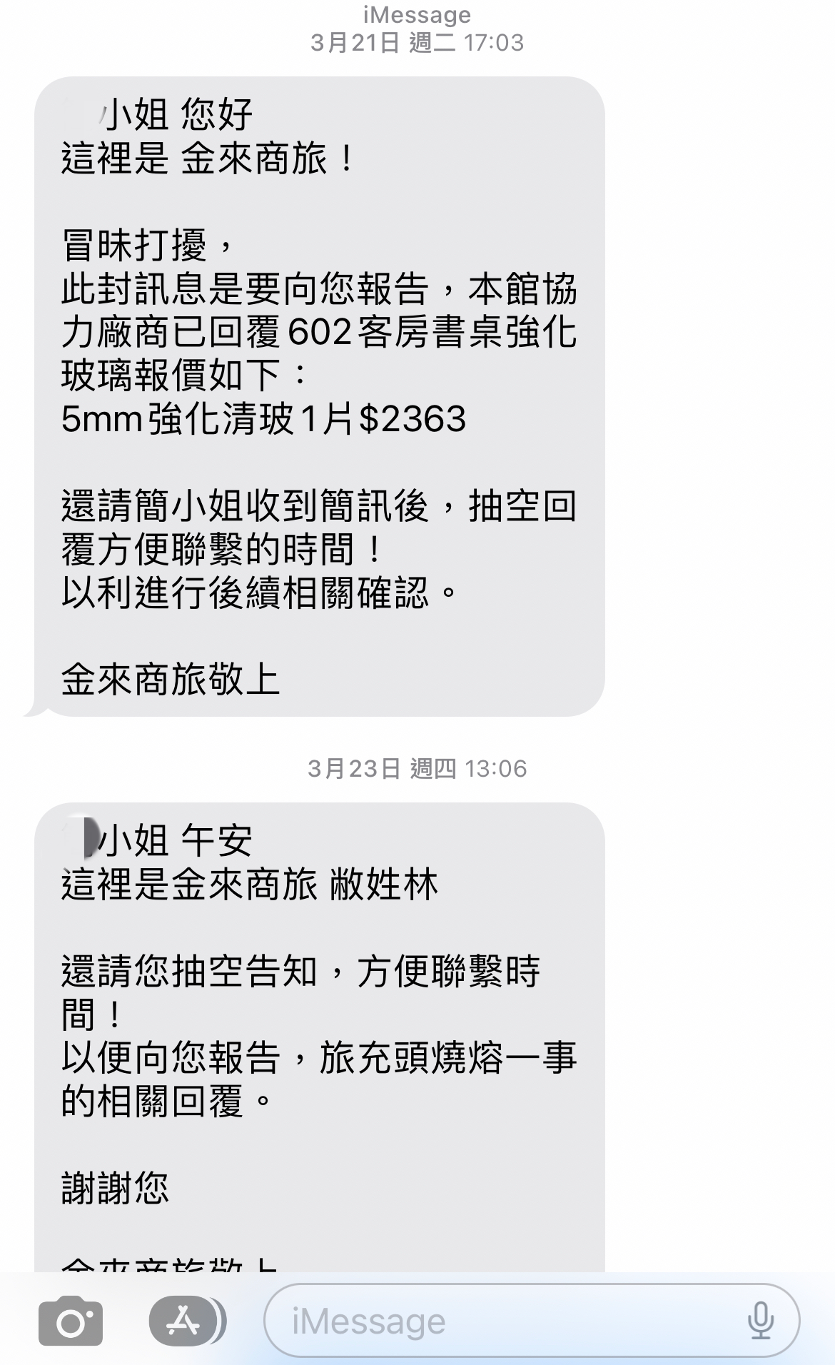 3/21飯店以簡訊方式要求賠償強化玻璃的金額2363元。對此舉動感到不服。致電協調,以及要求住宿退費賠償2805元。