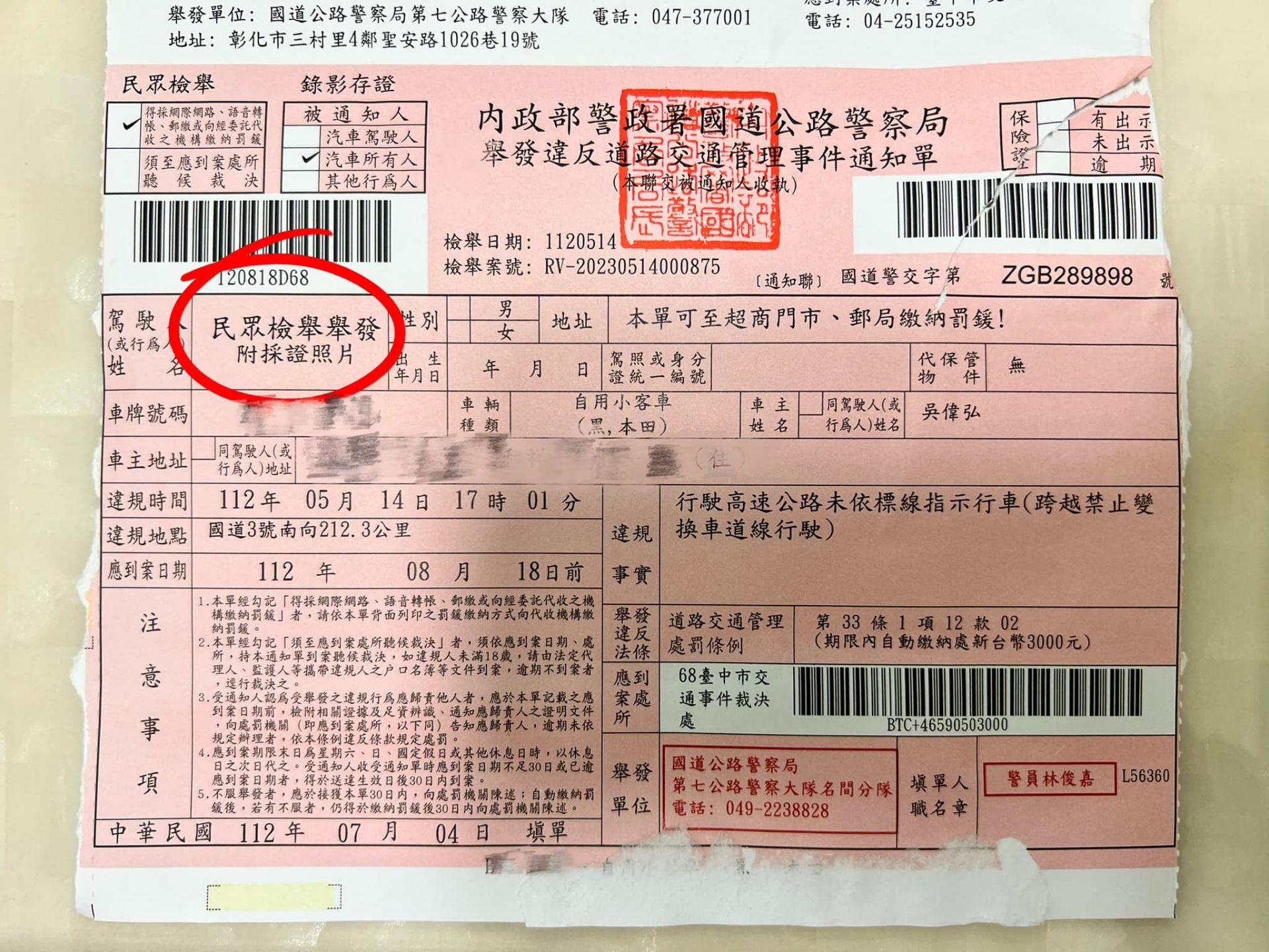 踏媽的!「我違規跨禁止變換車道」我知道錯