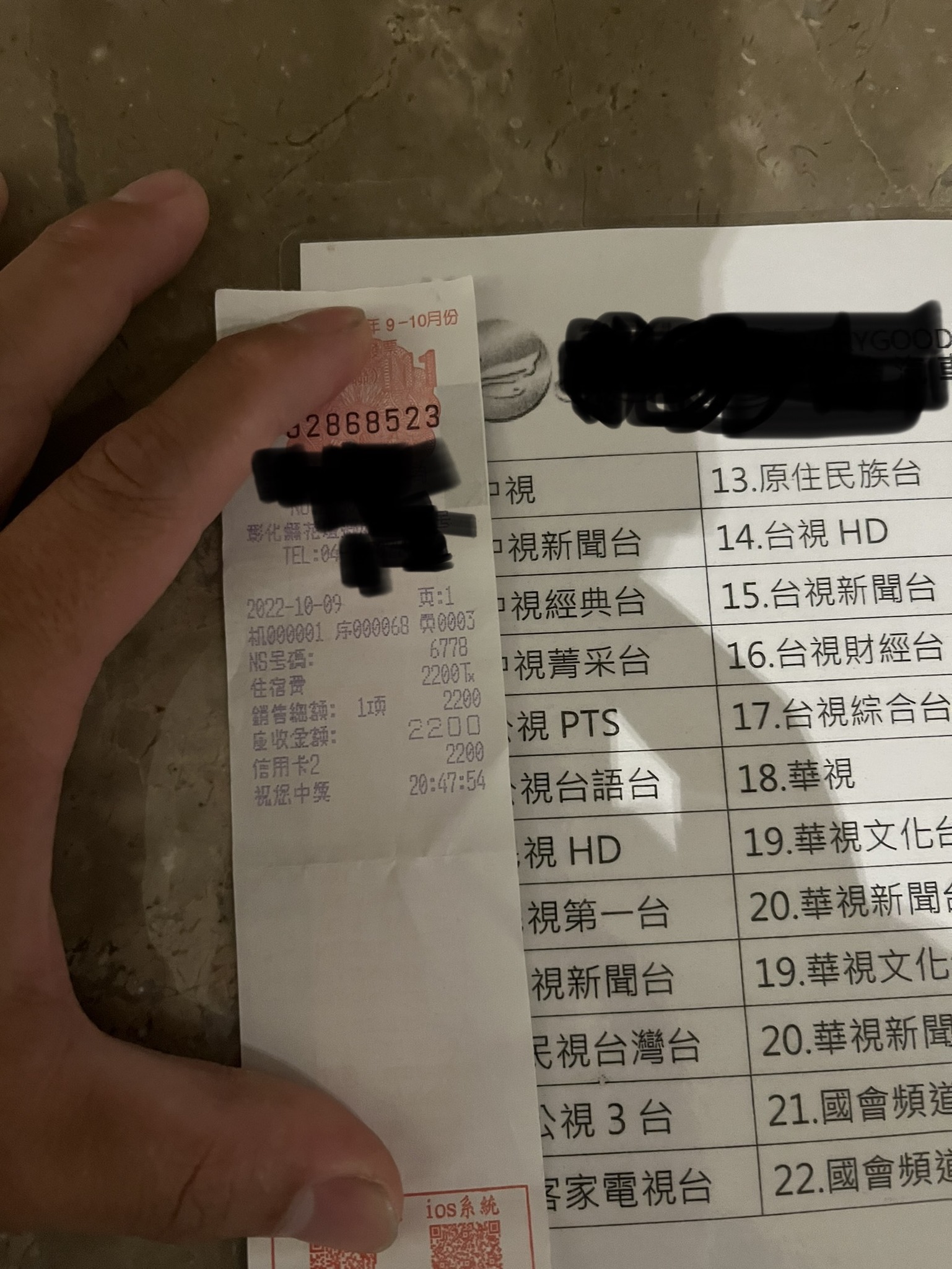 騎了1天的車,20:47到旅館(發票時間),一晚要價2200元