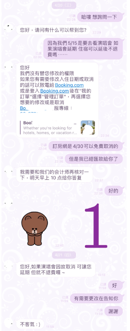 我們就告知民宿業者演唱會確定延期,且還貼給他延期的日期,10分鐘之後xxxx回應直接訂房網更改日期即可!(一直覺得雖然我們訂房網4/30前可以免費取消更改,但有什麼不確定性或是更改前我們還是會告知民宿業者,就覺得是種禮貌與尊重)