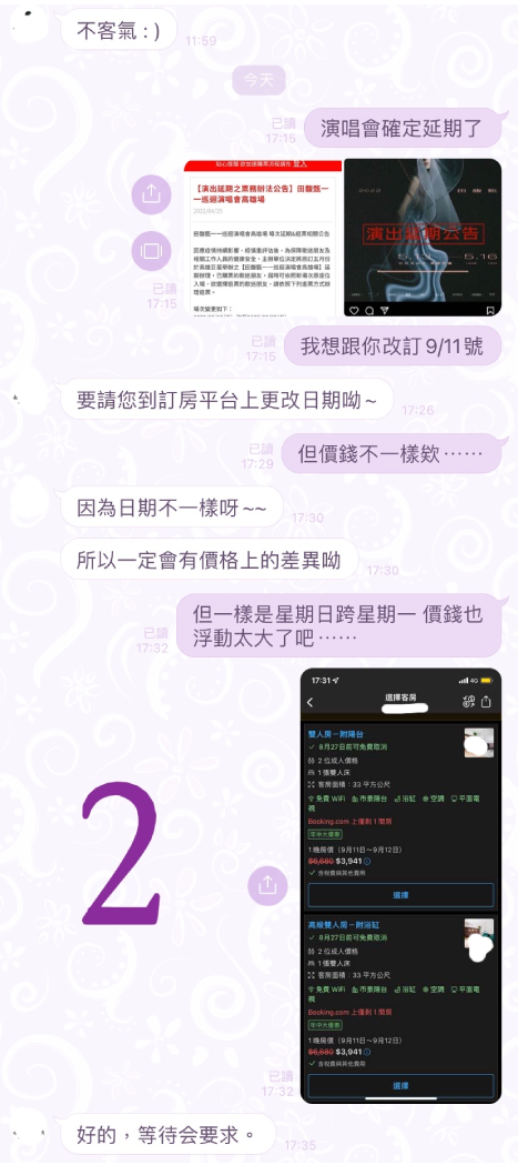 但因為消費者告知有演唱會,而抬高房價這感覺真的超差的欸!啊不就好險我們跟您說演唱會延期前有先看到9/11的房價原本是台幣1084元!不然被當盤子還在感謝您願意讓我們改訂單日期!
