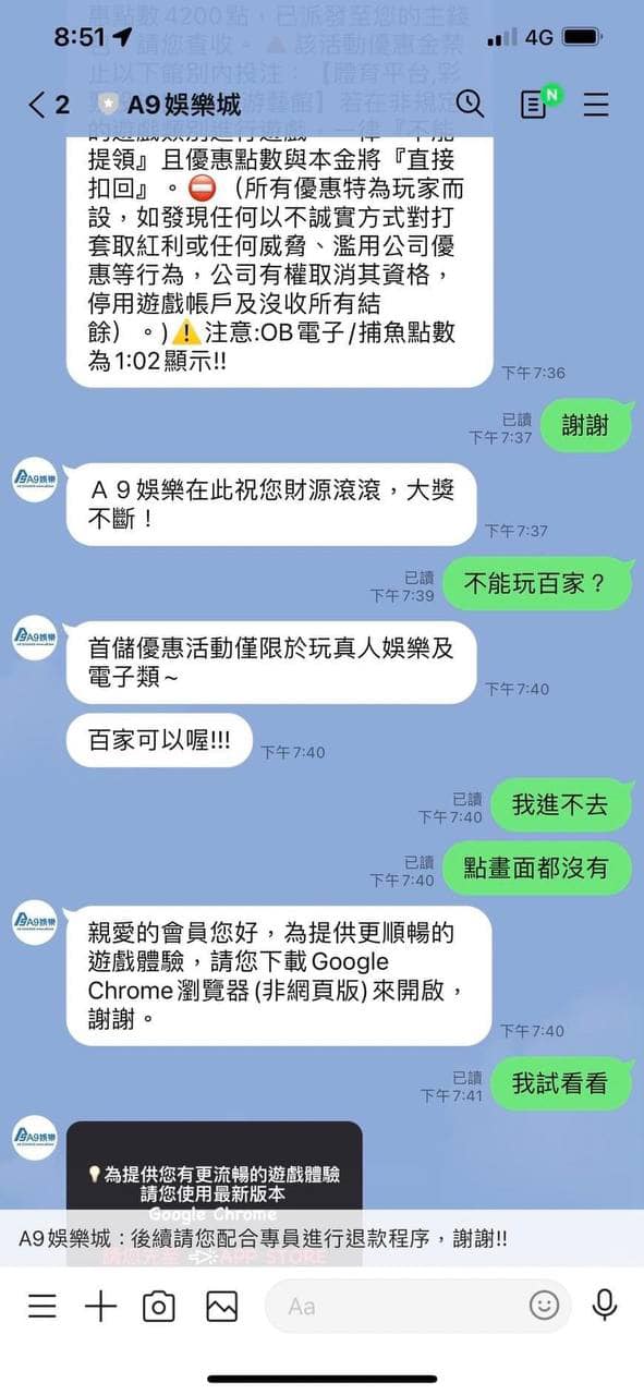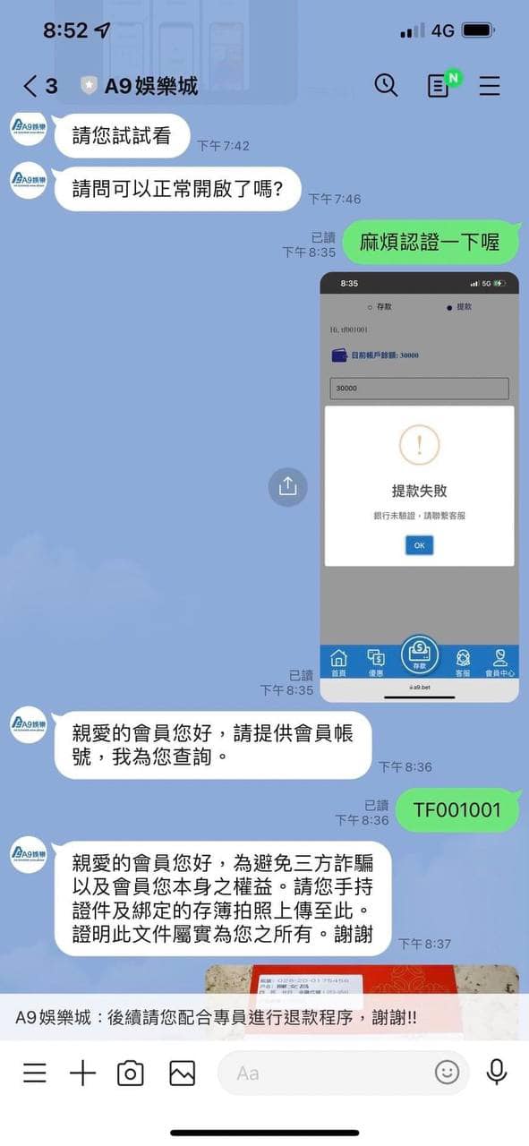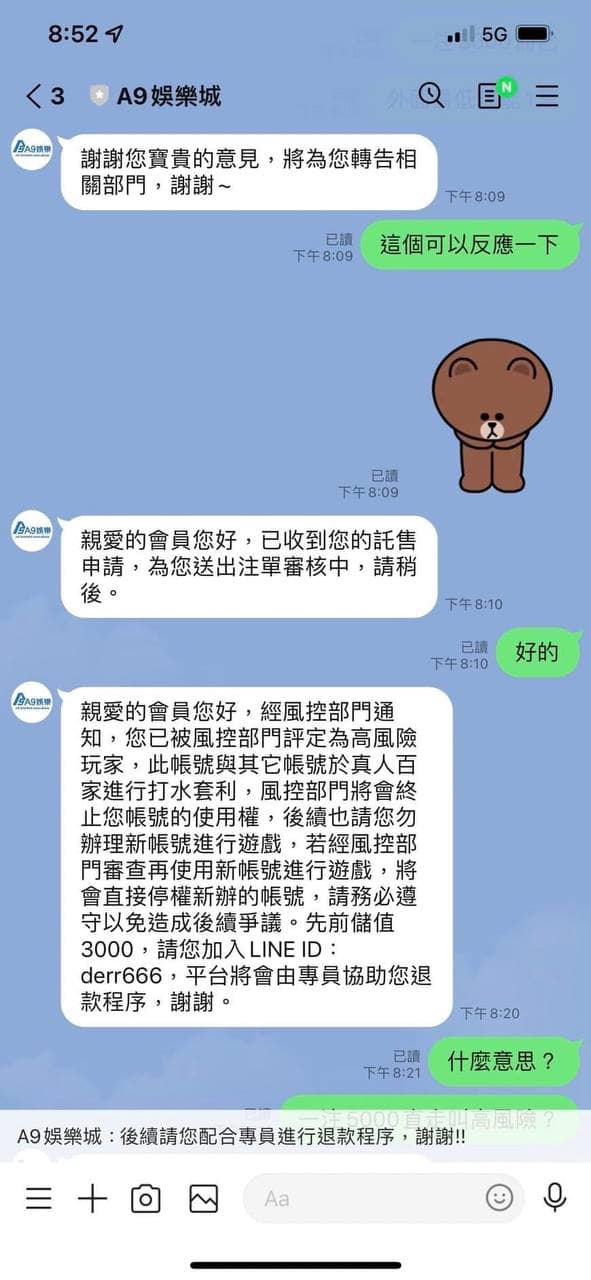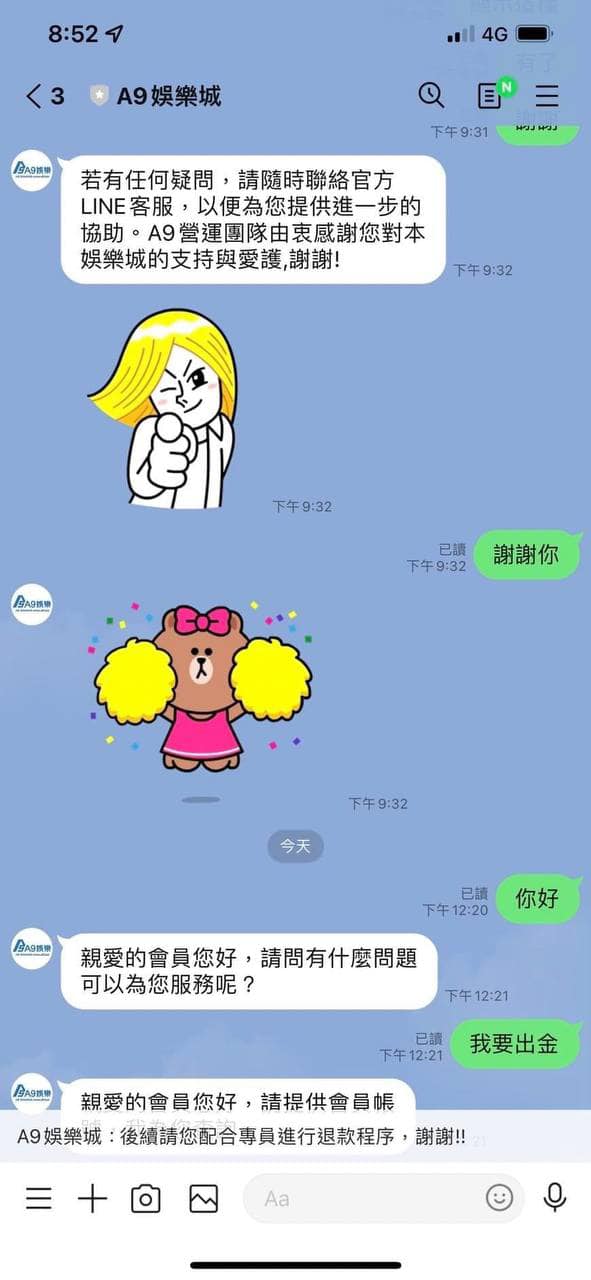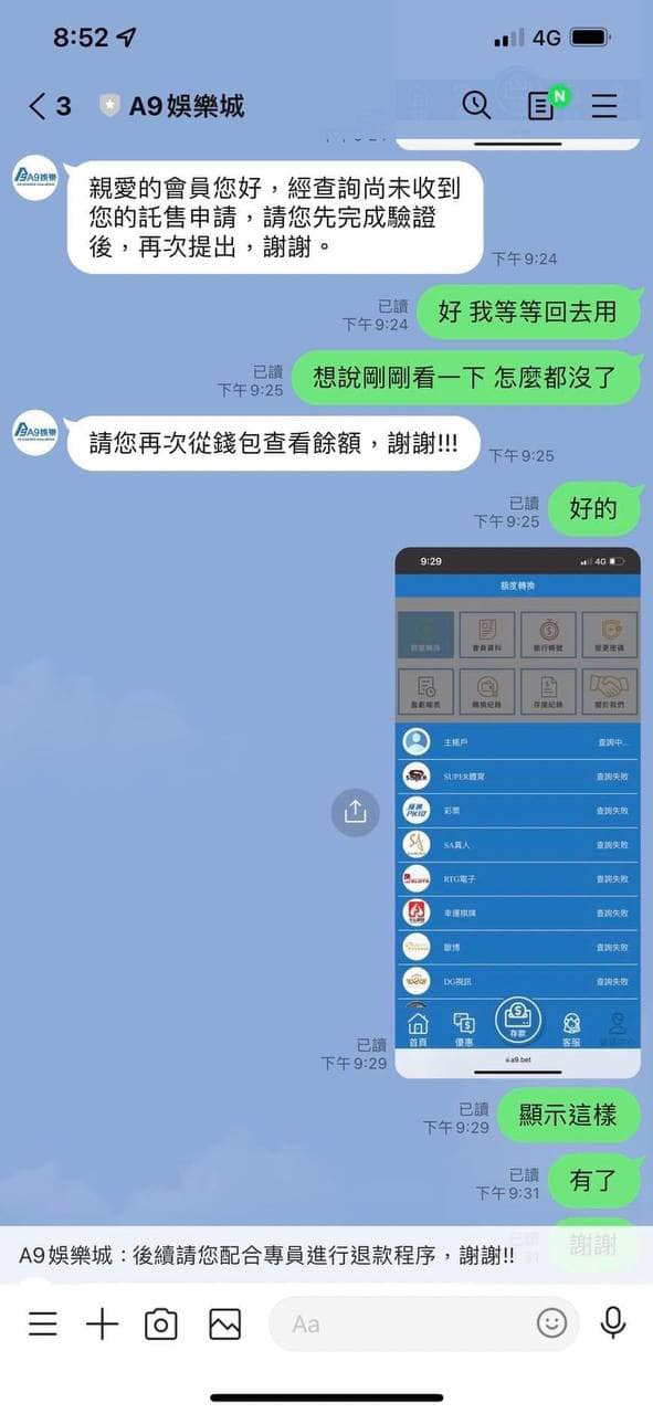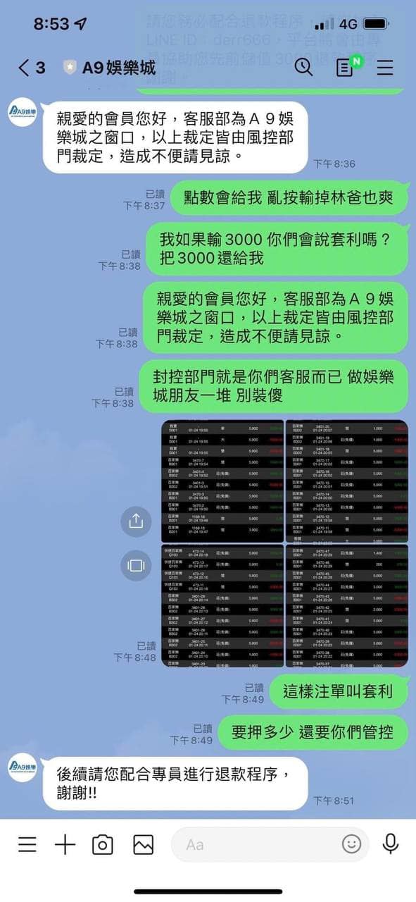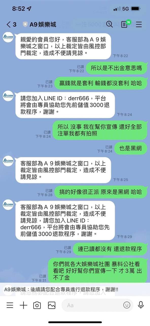 A9娛樂城是黑網喔!大家麻煩分享到各大社團 以免還有受害者 我5000直走叫套利 才3萬而已不出金 一直刁難 連本錢3000我也送給他們買棺材