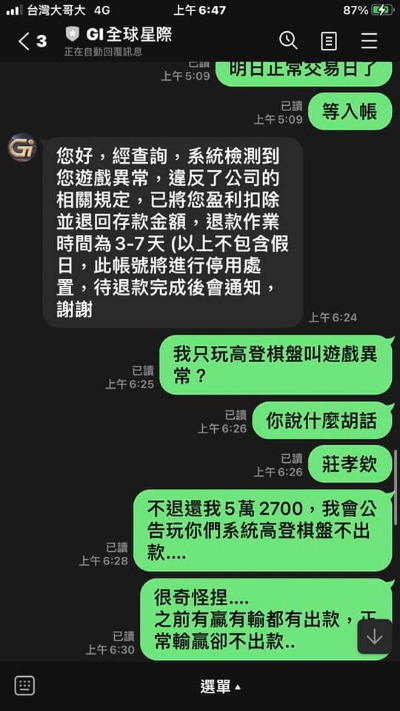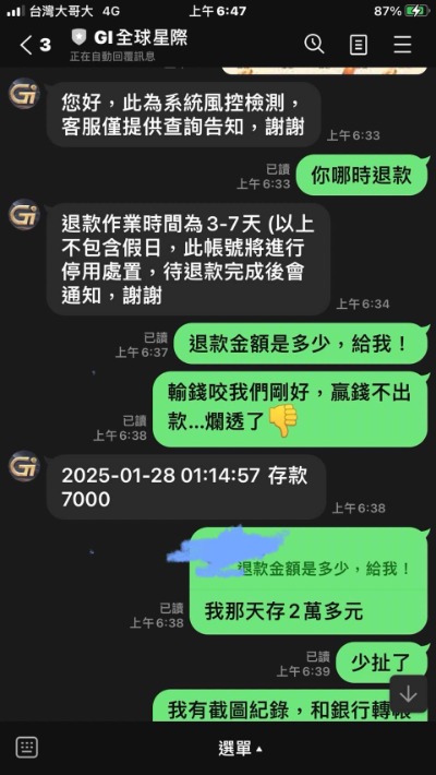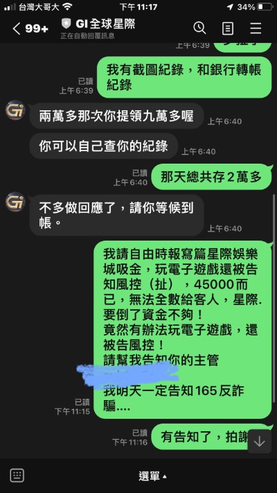我在這裡呼籲所有在看這篇文章的人,如果你還在猶豫要不要儲值,或是已經在裡面玩的,趕快收手!輸錢我們認栽,那是運氣問題,但「贏錢不讓提」這就是人品跟信用問題。這種詐騙手法真的臭到不行,大家眼睛放亮一點,別再讓自己的血汗錢進了這些詐騙集團的口袋。GI全球星記娛樂城,真的垃圾,大家快逃!